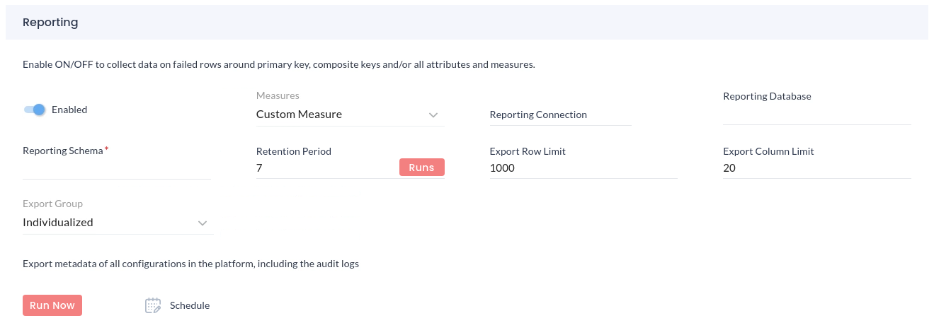Reporting is enabled when a user requires the failed records of the measures to be pushed to a preferred external database. The following options are key in setting up the Reporting database: