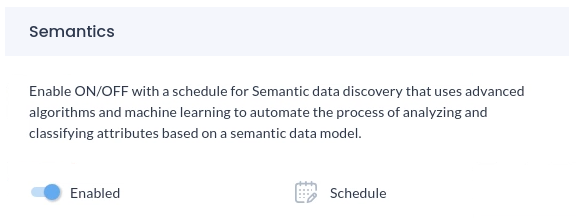 The semantics feature provides users with the ability to execute a Semantic data discovery job on a predefined schedule at the platform level. When configuring a connection, users can enable the option to Push semantics, which triggers the semantic job to classify data, push specified terms according to Semantics, and more.
