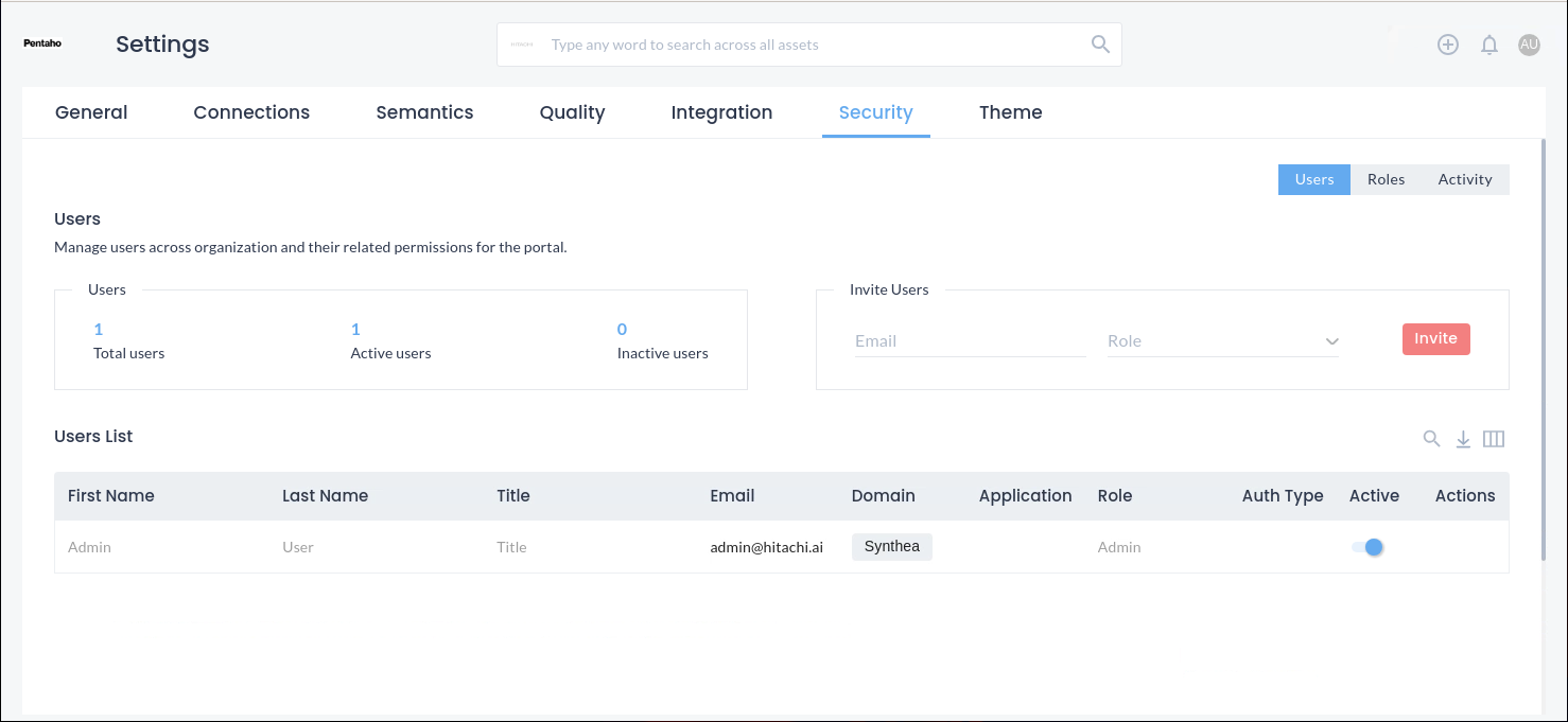 Manage users across the organization and their permission levels for the portal. It provides the details of Total users, Active Users, and Inactive Users.