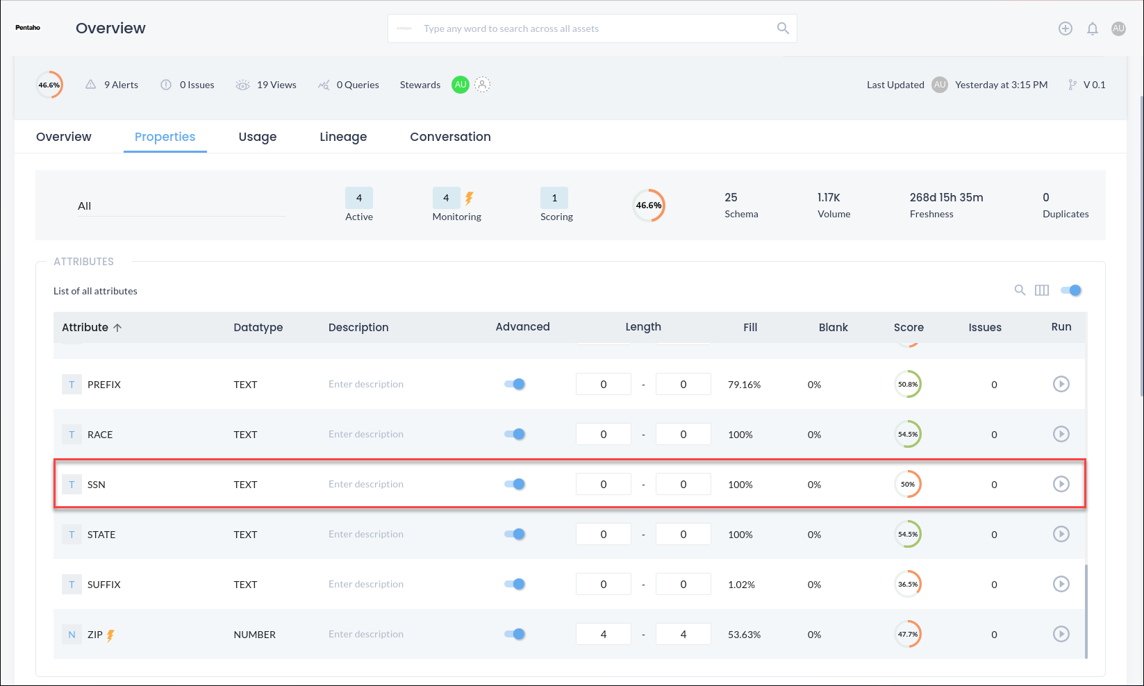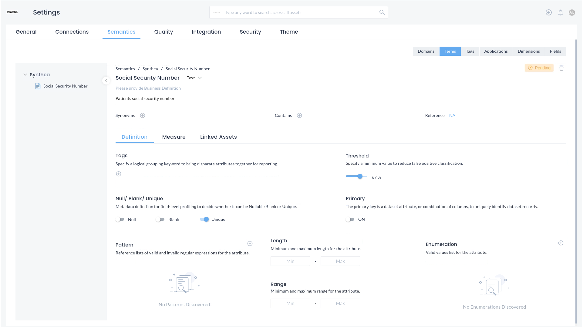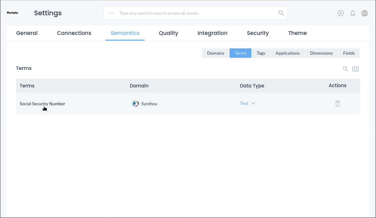 PDQ provides the ability to define semantic terms, tags, applications, dimensions, and fields which can be assigned to an asset, attribute, and rules to categorize the data accordingly. Once the semantics are defined the platform will auto-discover the data type and field type and will automatically apply them across the organization's data asset.