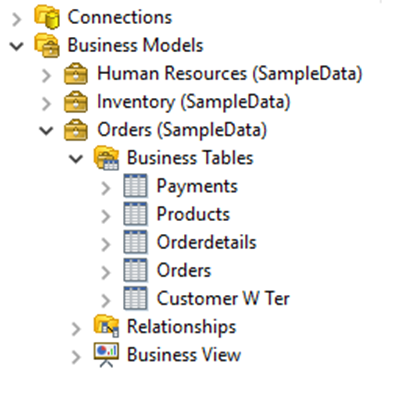 In the Business View, you can create any number of categories and arrange your business columns in those categories however it best suits your business, mixing and matching columns that derived from different business tables, even adding business columns more than once to different categories. The only restriction to the Business View is you cannot add the same business column more than once to a single category.