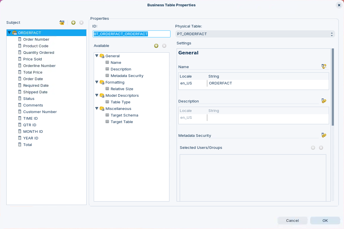 In the Manage Categories dialog, in the Available Business Tables pane, expand ORDERFACT.