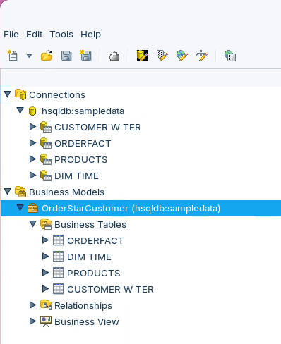 These imported tables form the physical foundation of the metadata model and can be verified in the Connections tree under hsqldb:sampledata, representing the raw database structures that will later be transformed into business-friendly abstractions through the Business Model and Business View layers.