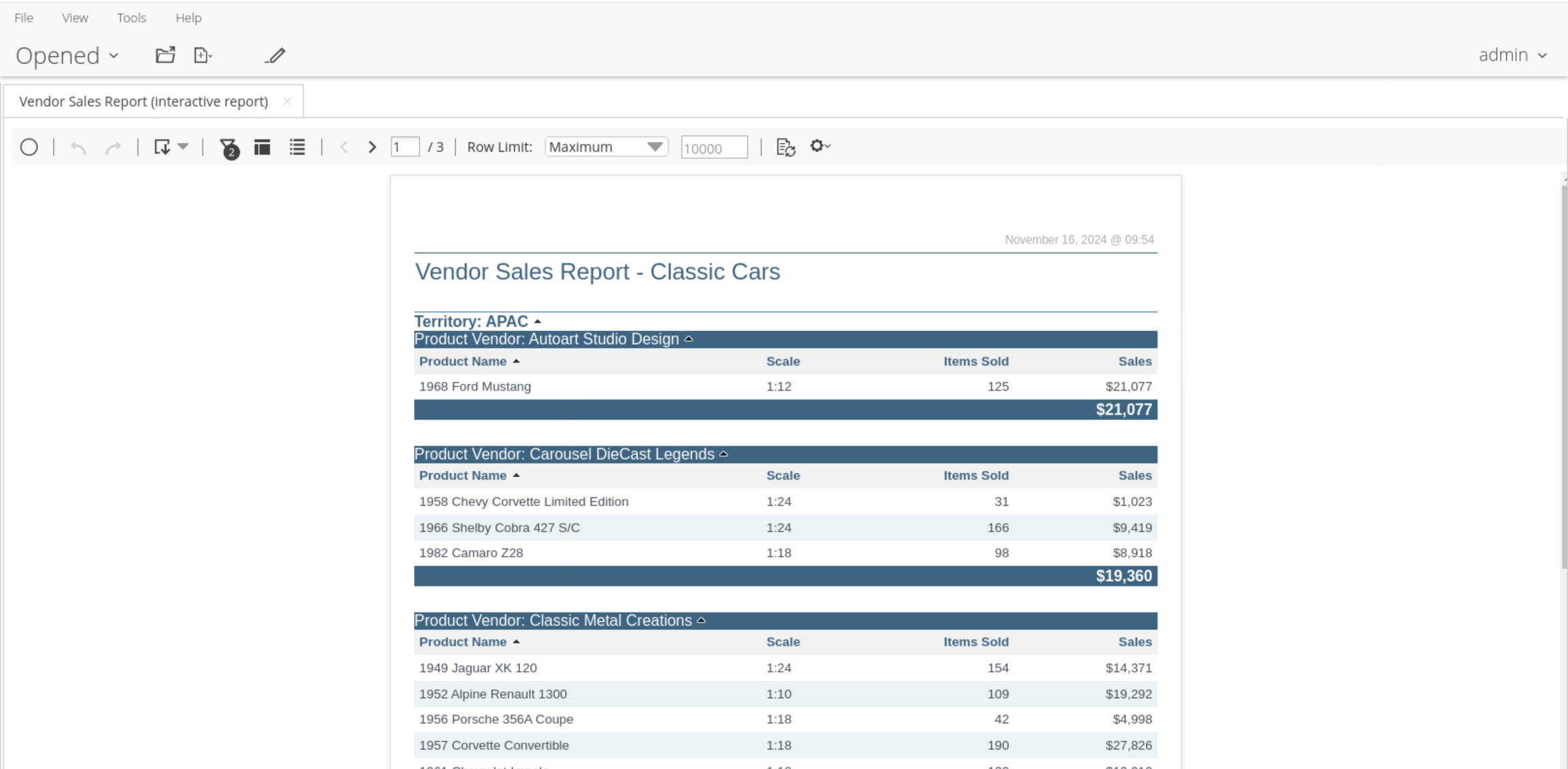 The tool supports various data sources, including databases, spreadsheets, and big data platforms. Key features include the ability to create ad-hoc reports, interactive filtering, parameter input, and the option to export reports in multiple formats such as PDF, Excel, and HTML.