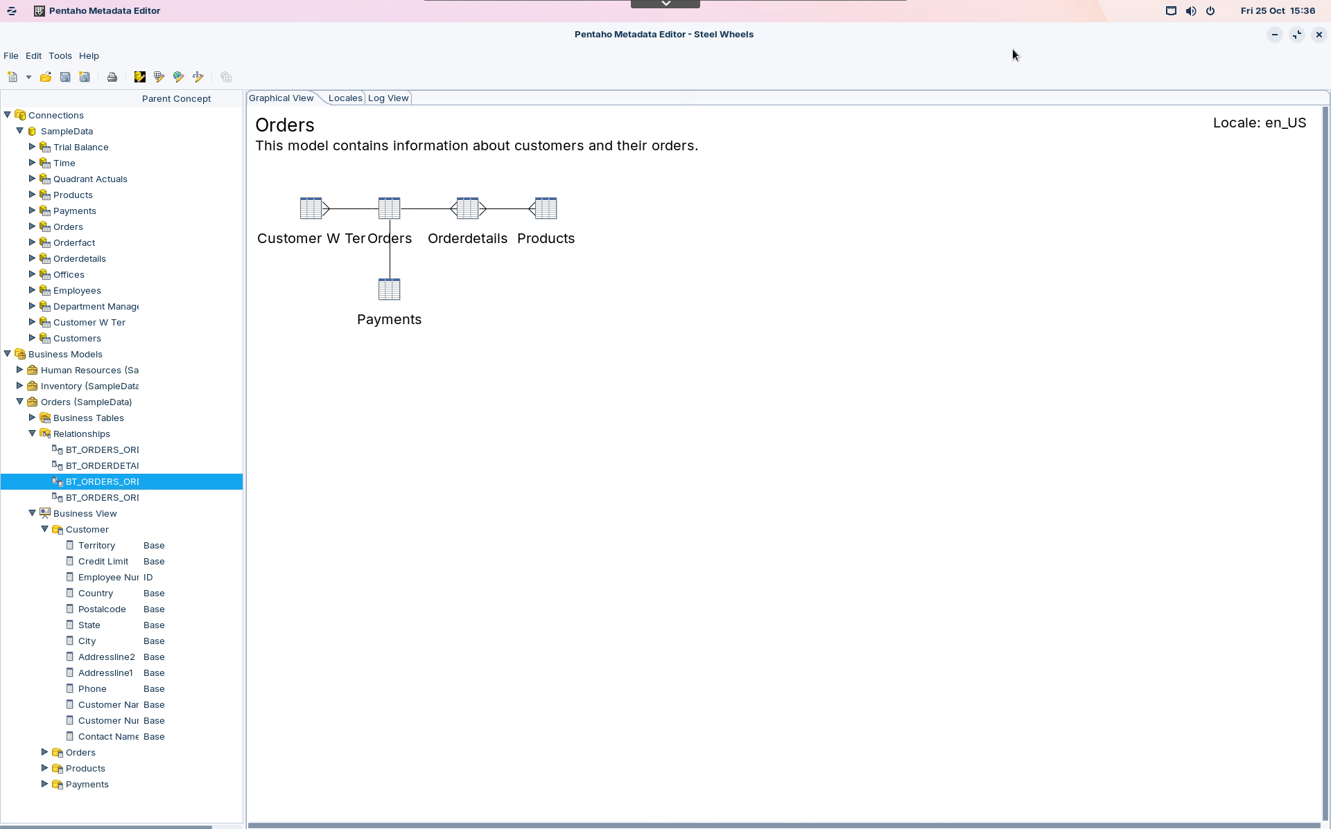 Pentaho Metadata Editor removes the need for you to know query languages, such as SQL. Queries are generated based on the metadata selection. The metadata model allows you to create an Interactive Report without knowing the complexities of the database structure. Some examples of metadata include the names of tables and columns. Also included are the relationships between columns and tables, security, and access rules.