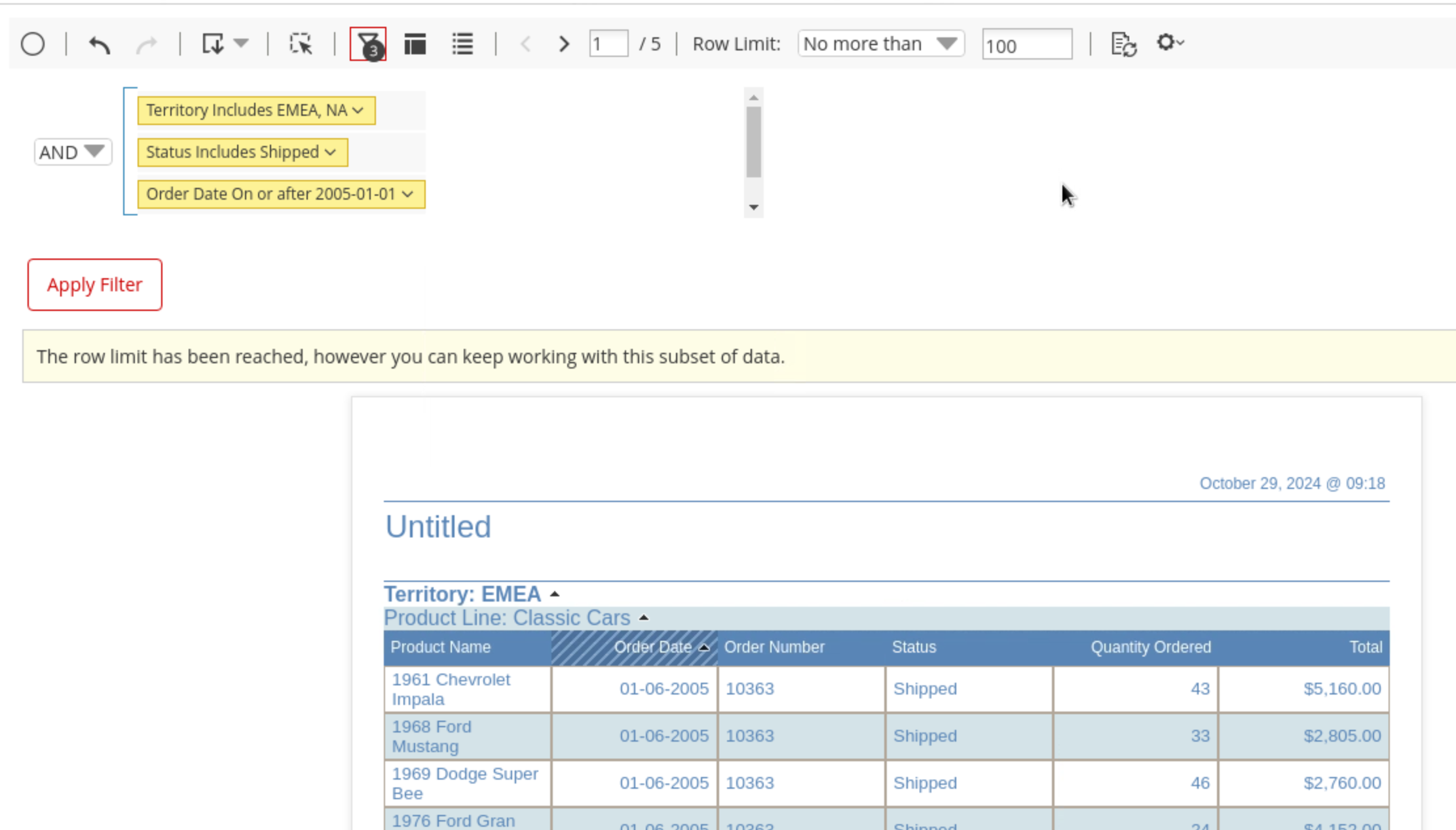Real-world business reporting often requires filtering data to specific regions and time periods to support strategic decision-making. In this advanced workshop, you'll create a comprehensive filtered report for Steel Wheels that displays order details for the EMEA and NA territories, focusing on orders shipped on or after January 1st, 2005. This workshop builds on your Interactive Reporting foundation by introducing more sophisticated filtering, grouping, and data presentation techniques.
