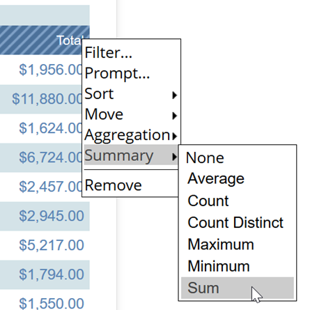 Add summary calculations (Sum) on the Total column with properly labeled subtotals and grand totals