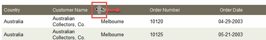 To resize the Customer Name column, click the resize bar between the Customer Name and City column headers and drag it to the right.