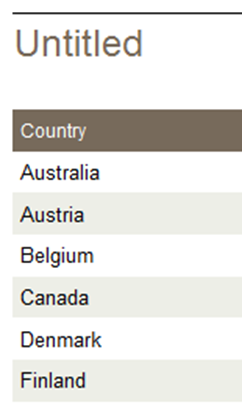 From the Data panel, select Country and drag it to the Report Canvas. A blue vertical line appears, indicating where the column will be placed.