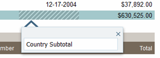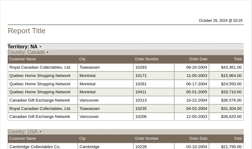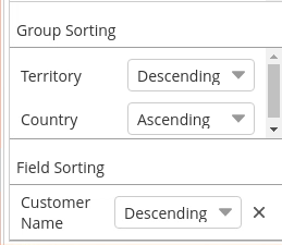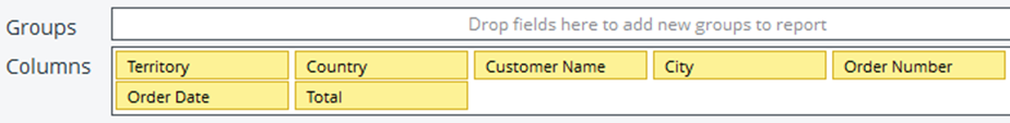To add a subgroup, on the Report Canvas, click the Country column header and drag it below the Territory group.