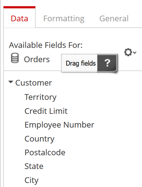 From the Data panel, select City and drag it to the Report Canvas. The vertical line indicates the option of either displaying the data as a column or row. Drop City to the right of Country.