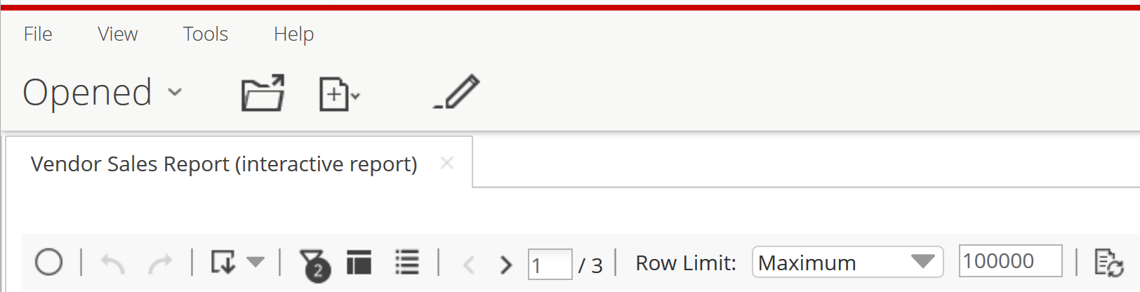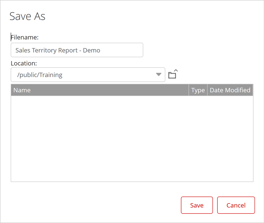 You can save your report using the Save or Save As toolbar buttons, or by selecting File > Save or File > Save As from the menu. When you save the report, you must specify both a filename and a repository location.