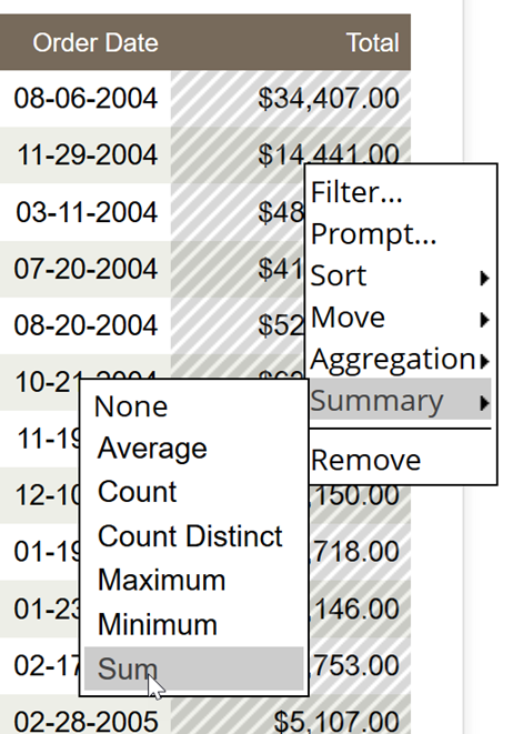 To apply a summary function to a numeric value, click the drop-down arrow next to the column header, and then select Summary from the context menu.