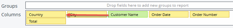 To rearrange columns from the Layout panel, on the Columns line, click Customer Name and drag it between Country and City.