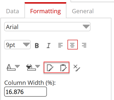 Formatting options such as font type, font size, colour, background colour, and text alignment are available under the Formatting panel in the Selection Pane. Buttons are also available to copy, paste, and remove formatting. To apply formatting, first select the object in the report. The appropriate formatting buttons activate based on the type of object selected.