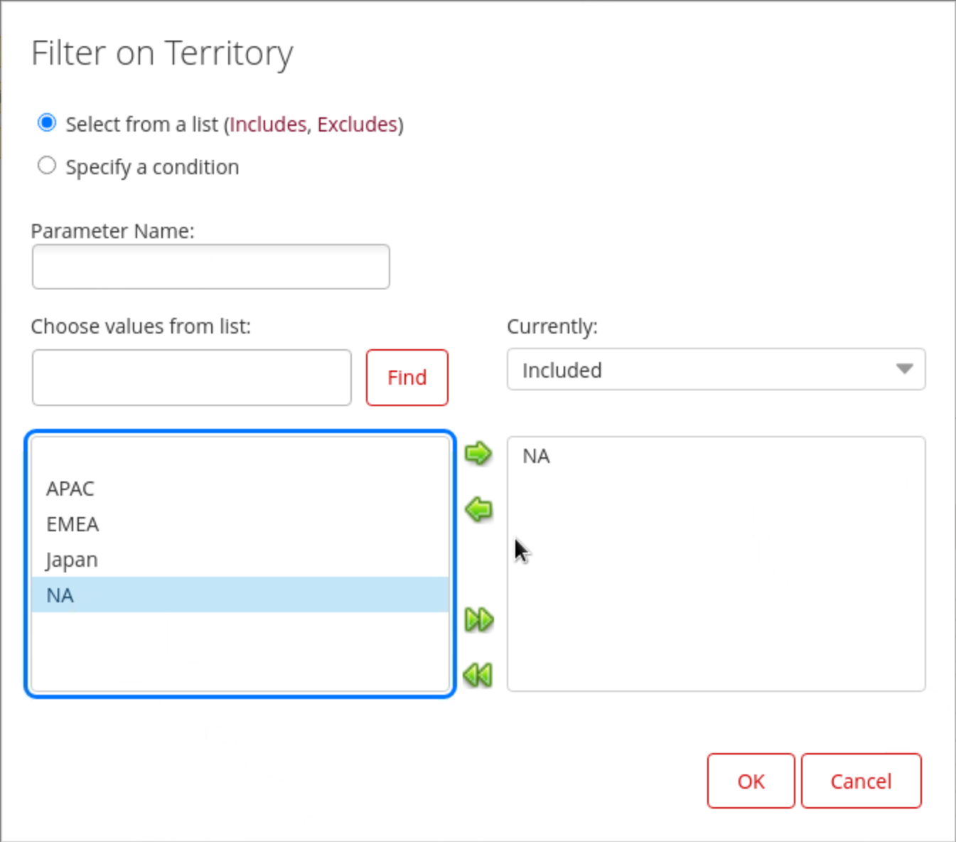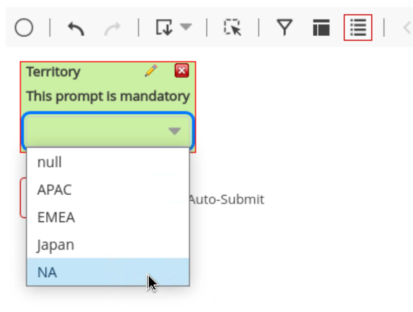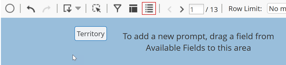 From the Data panel, select Territory and drag it to the Prompts panel.