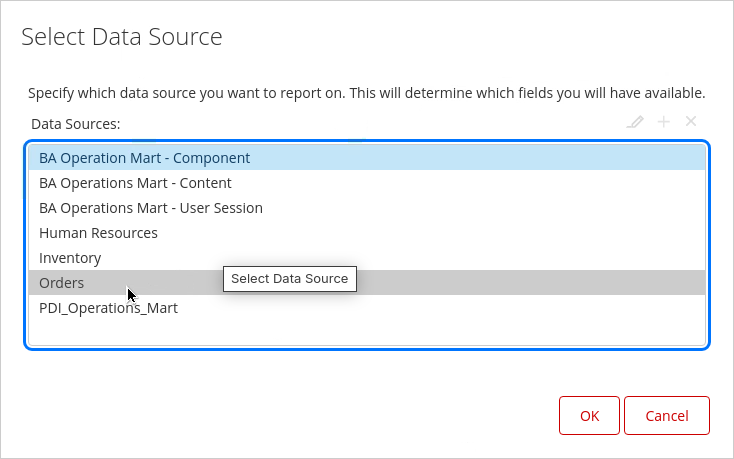 The first step to creating an Interactive Report is selecting a data source. Data sources are provided to you by an administrator or authorized user.