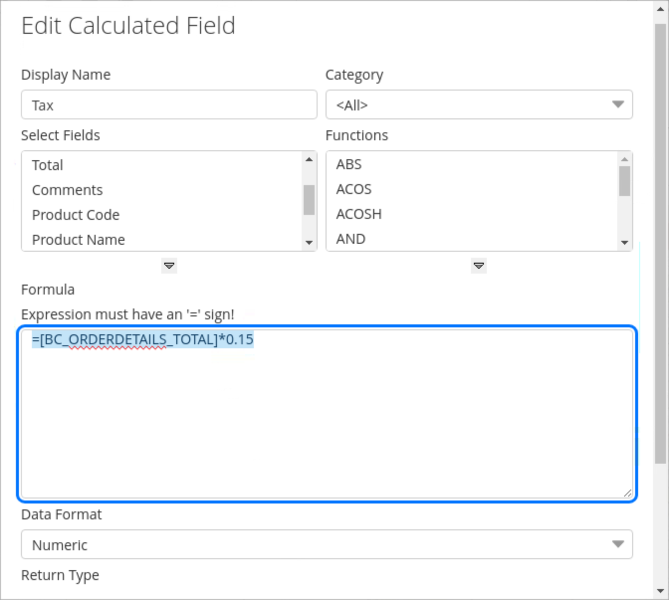 To calculate the Tax: =[BC_ORDERDETAILS_TOTAL]*0.15