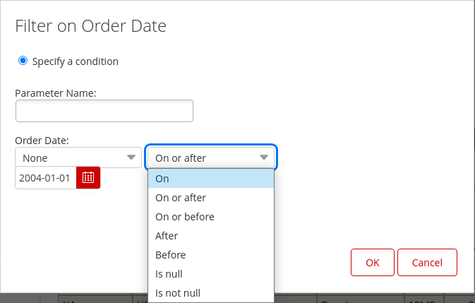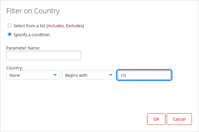 In the Filter on Country dialog box, select Specify a Condition, and from the available constraints drop-down list, select Begins with, then in the text box, type US, and then click OK.
