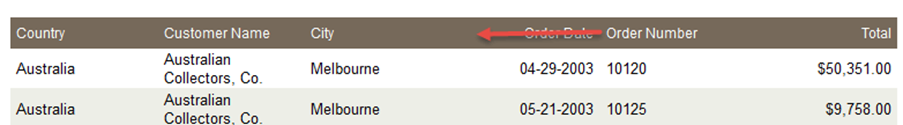 To rearrange columns from the Report Canvas, click the Order Number column header and drag it between City and Order Date.