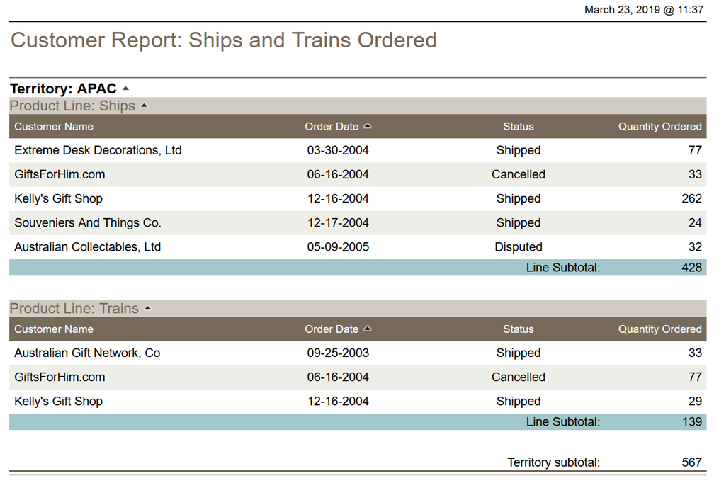 • The report should be sorted by Order Date and should show subtotals for each Product Line by Territory, as well as a grand total.