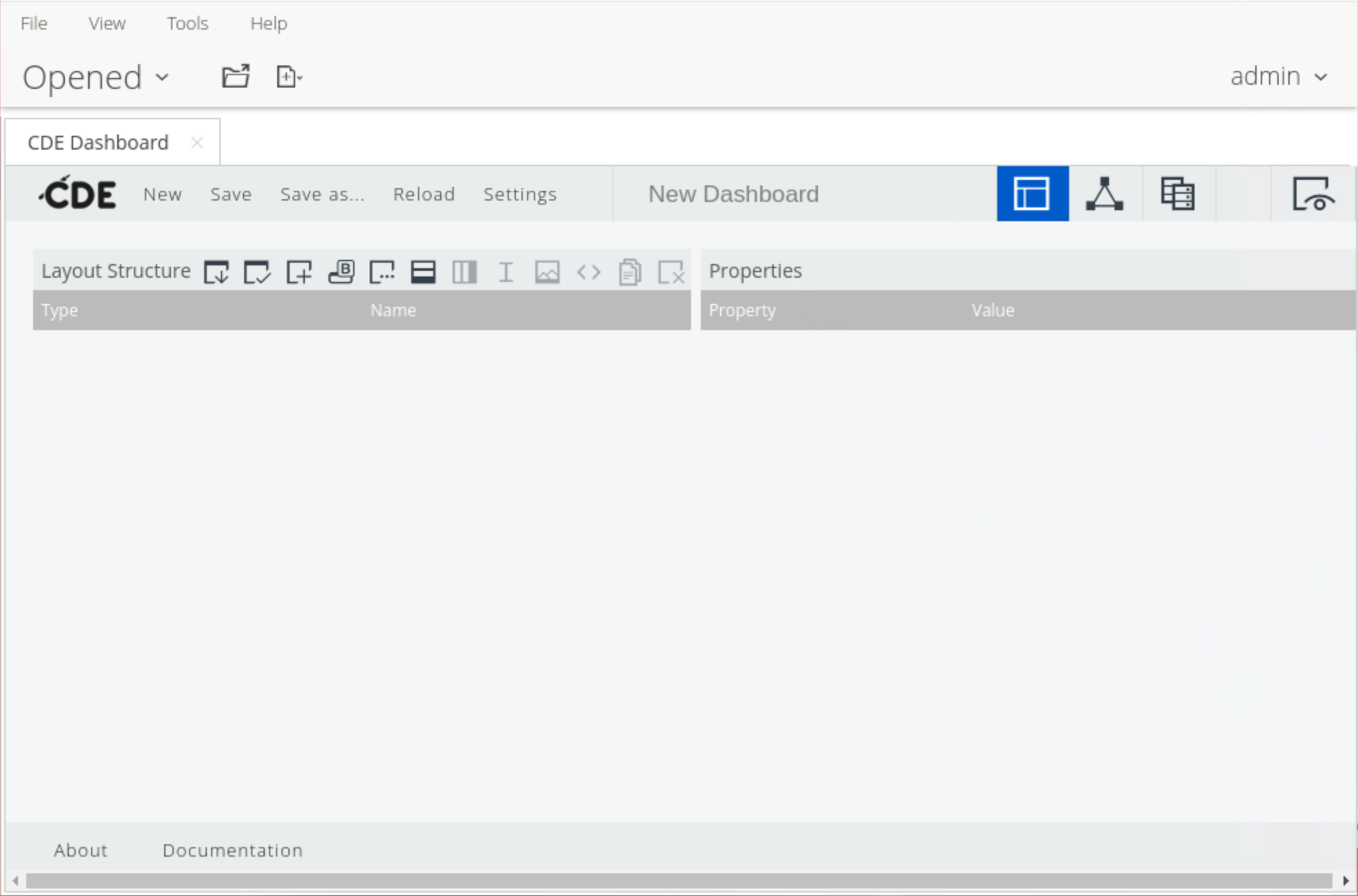 Select to create a new CDE dashboard. When clicked, a blank dashboard appears.