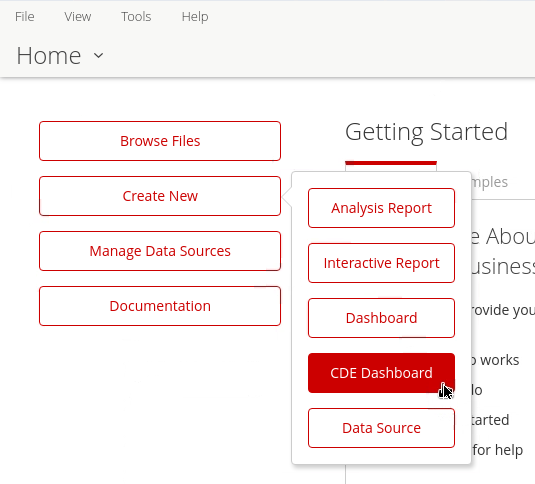 In the Pentaho User Console (PUC) and select from the menu: File -> New -> CDE Dashboard.