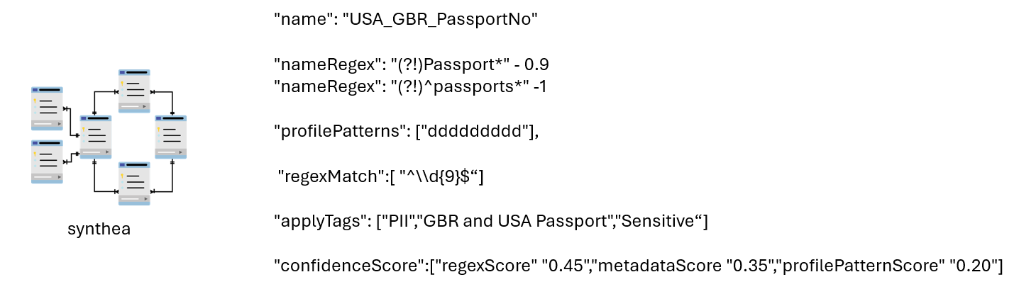 When the data is profiled, in our example: 'passport' the regexMatch will produce a profilePattern that can be compared (with a degree of confidence) against the predefined profilePattern; once matched Tags - PII, GBR and USA Passport, Sensitive are then applied.