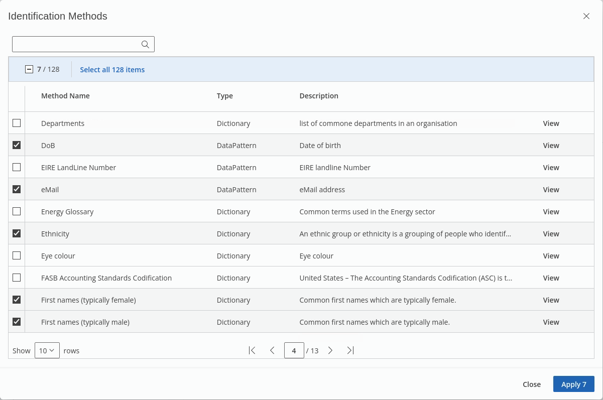 The dictionaries and data patterns are together referred to as data identification policies. There are many policies included with Data Catalog, covering categories from a wide range of business sectors, such as Finance, Education, Aviation, Law Enforcement, PCI-DSS and Data Privacy.