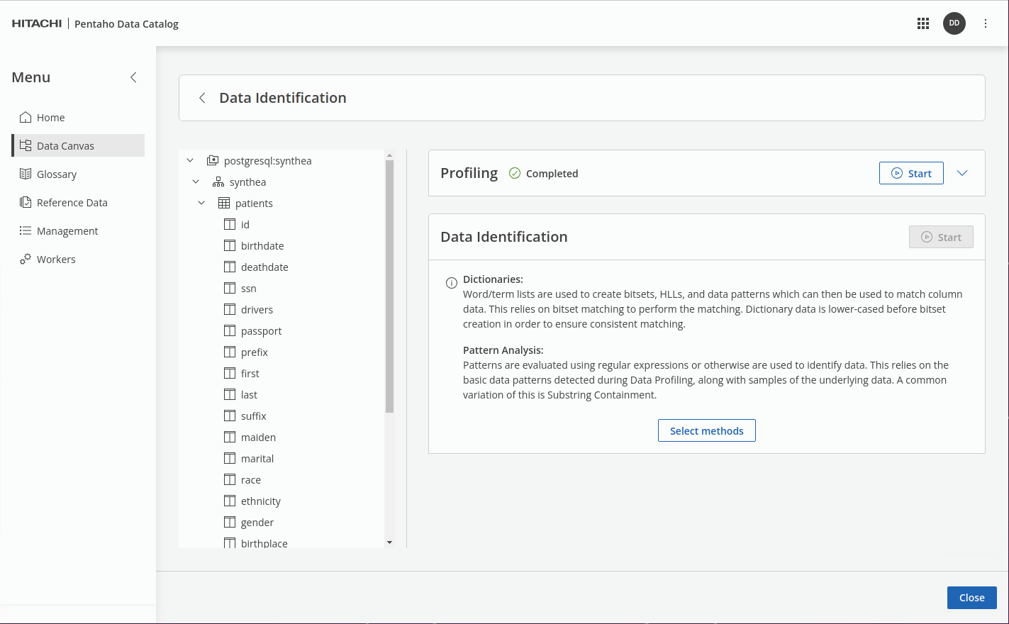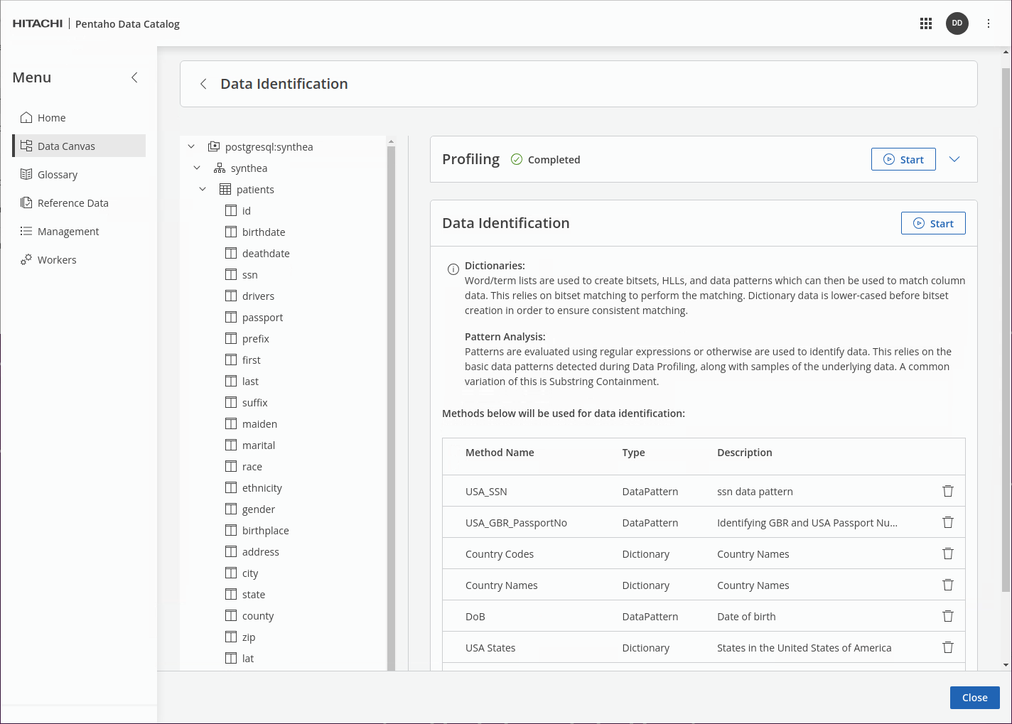 Pentaho Data Catalog uses data identification methods called Dictionaries and Data Patterns to help you identify data.