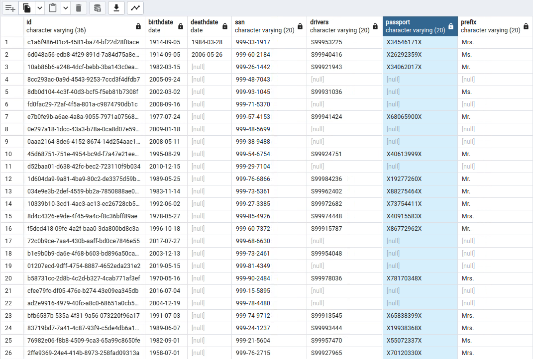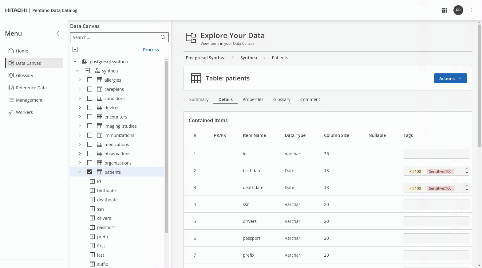 In Data Canvas, check that the sensitive data in the Synthea -> 'patients' table has now been identified - tagged as PII & Sensitive.