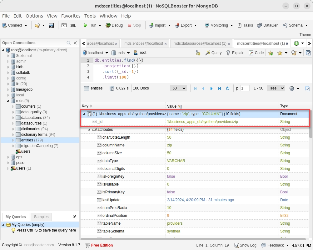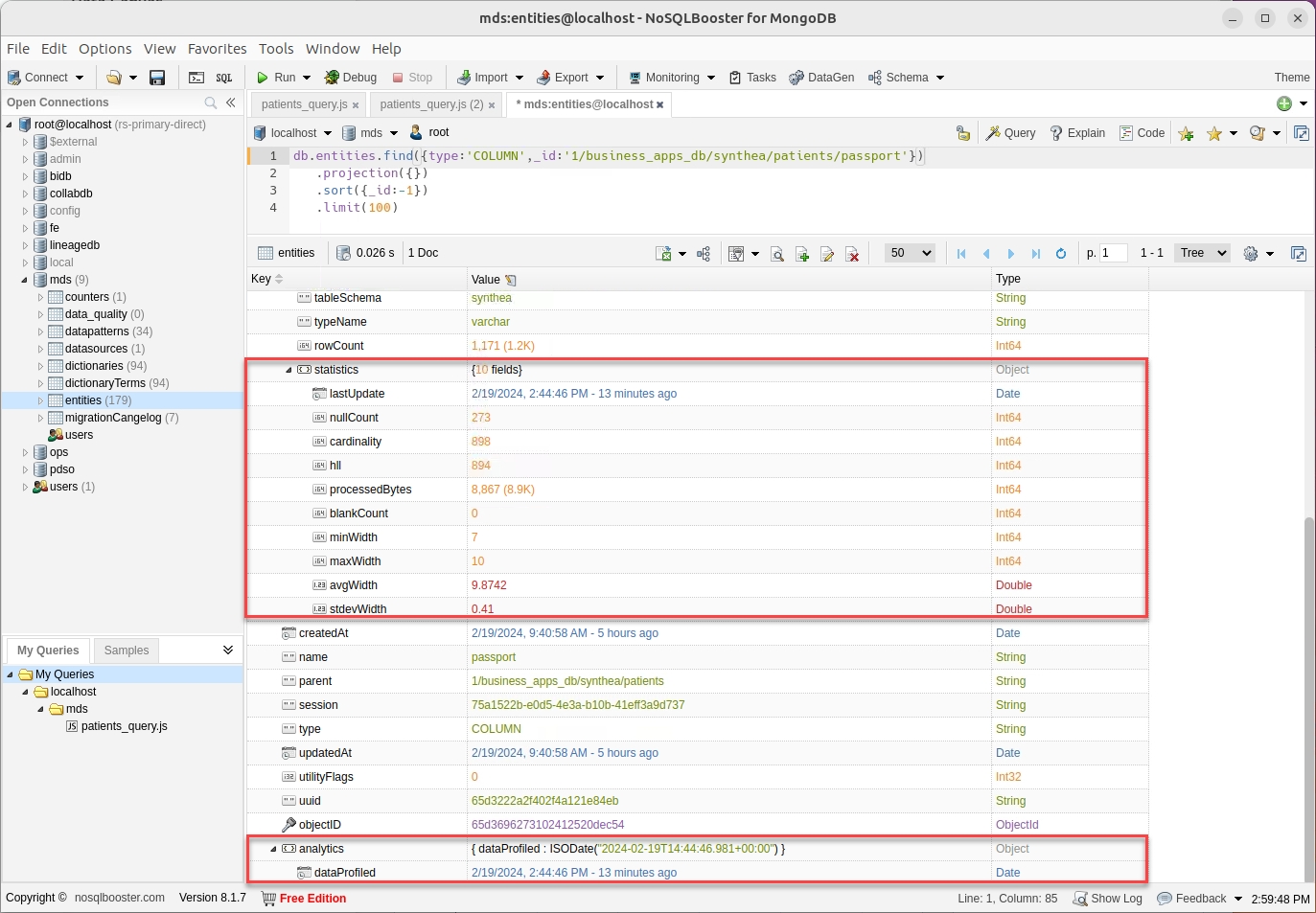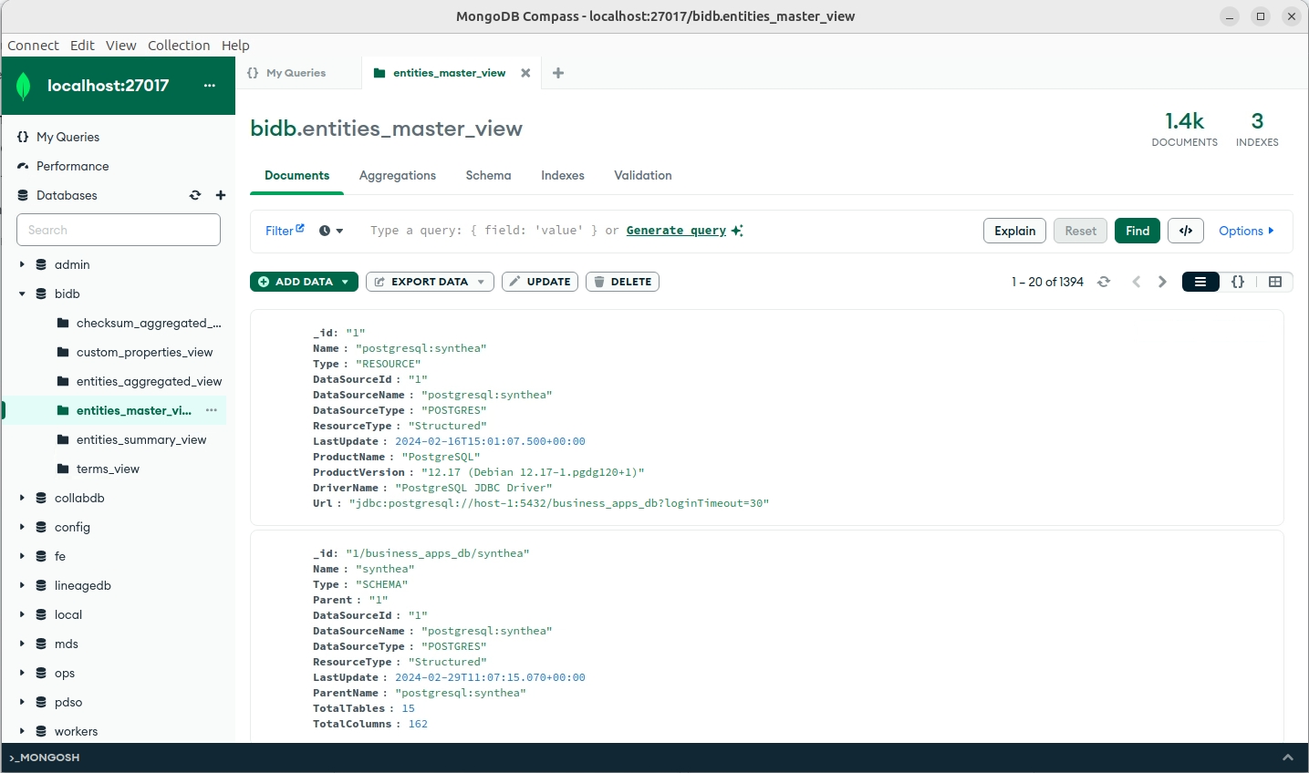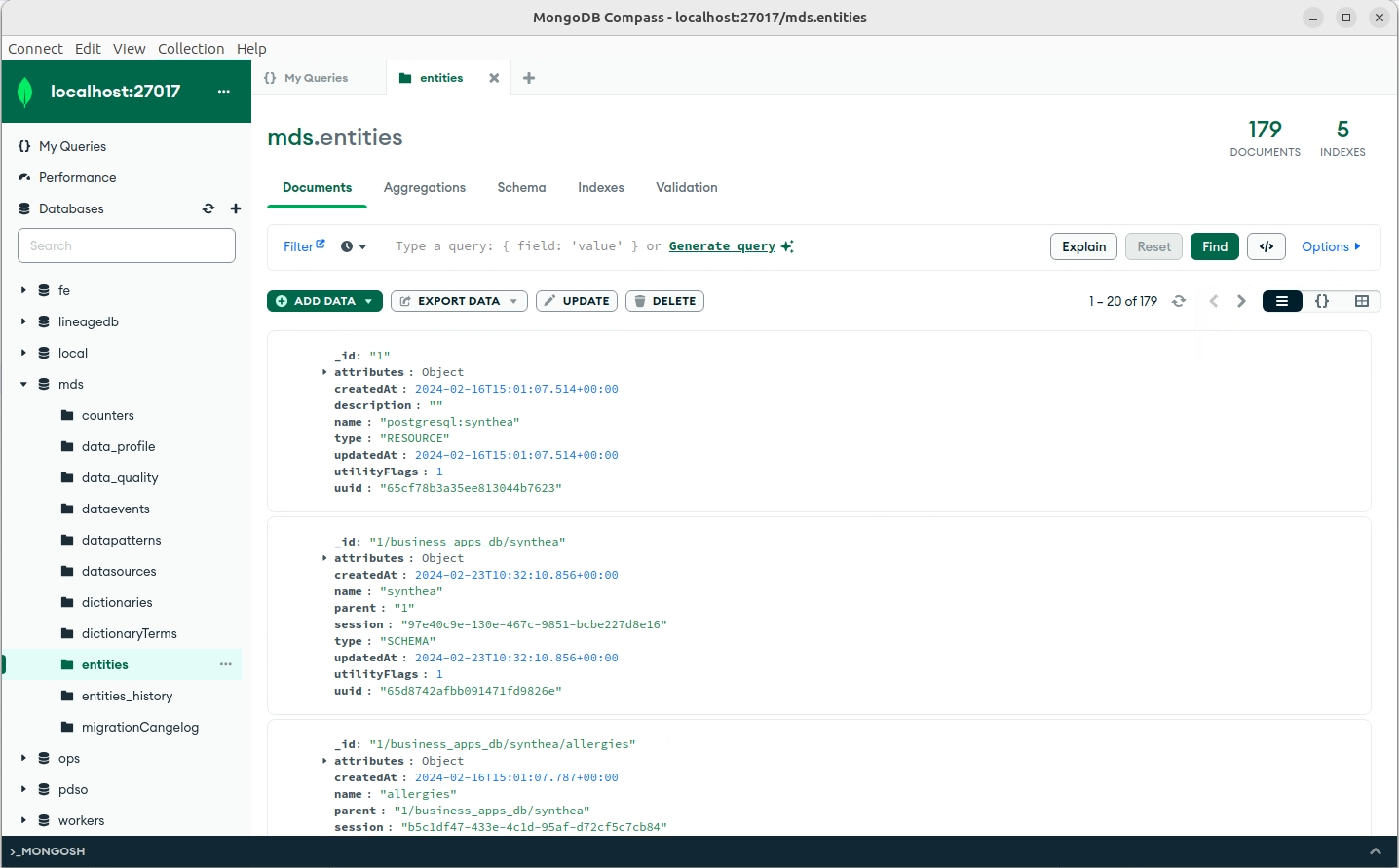 The database schema metadata details are persisted in the entities collection (synthea - 179 documents).