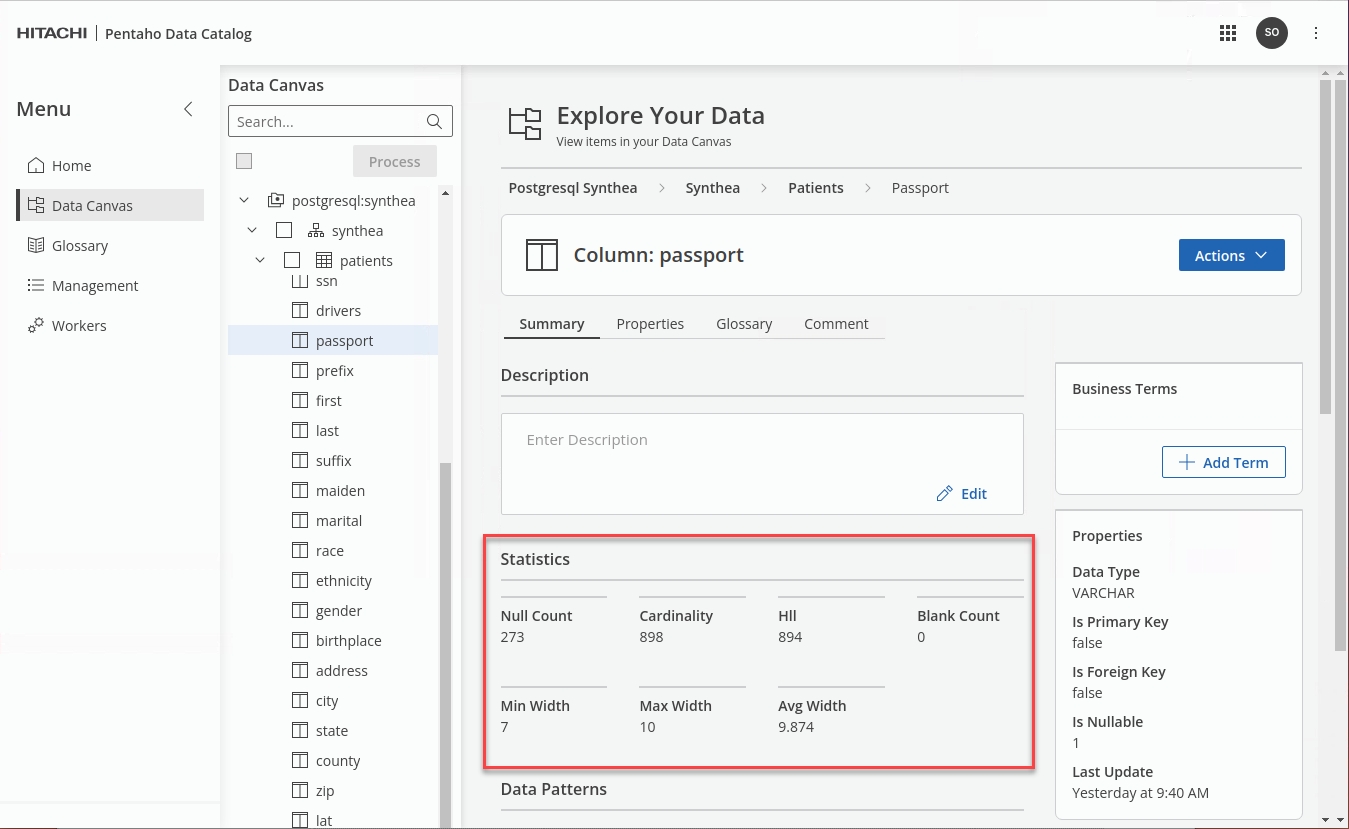 The Statistics, Data Patterns and Properties are displayed in the Data Canvas.