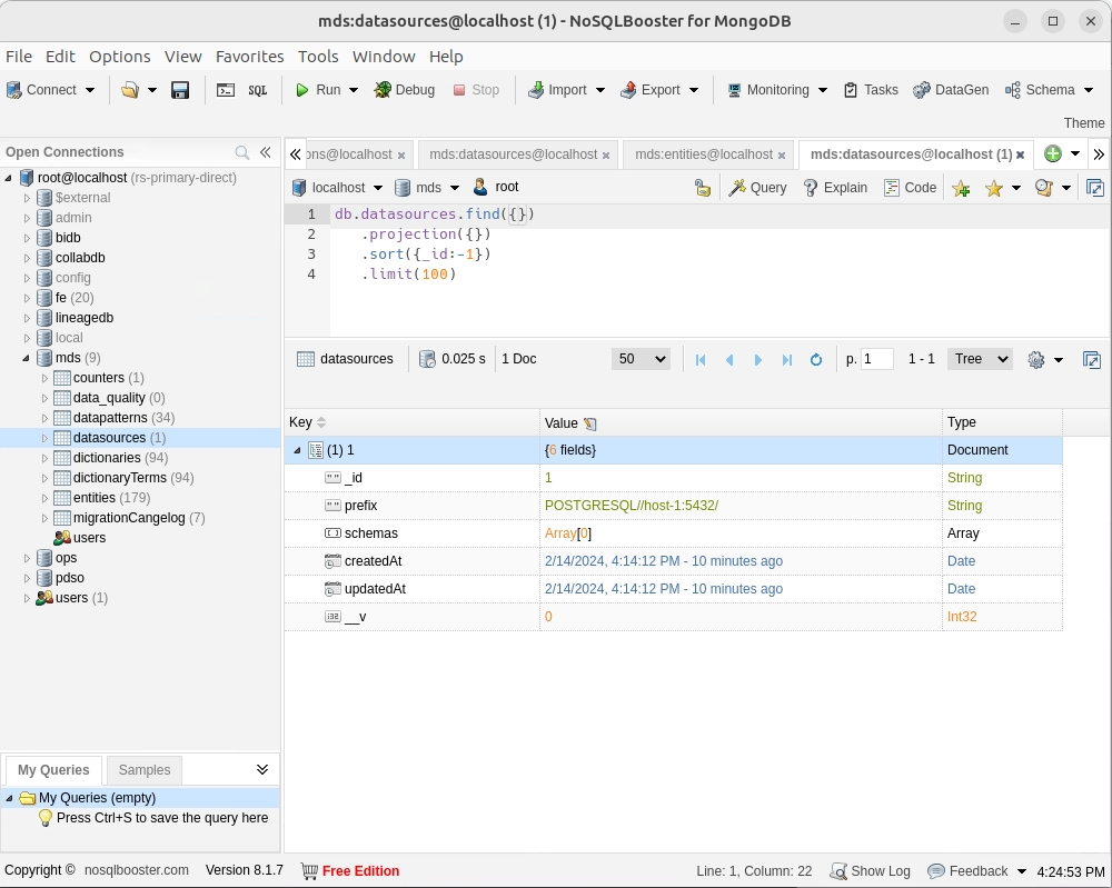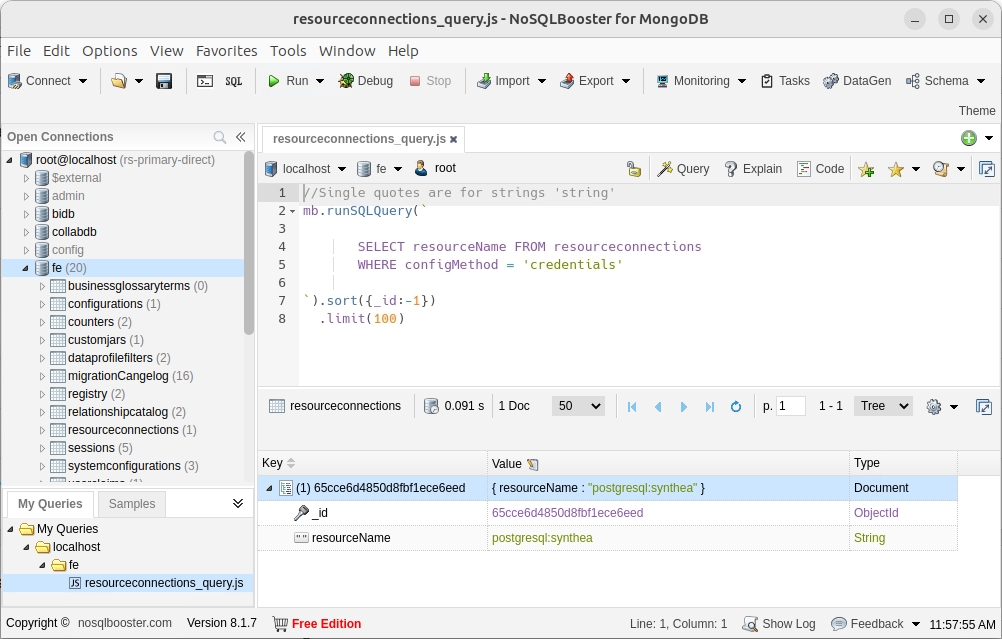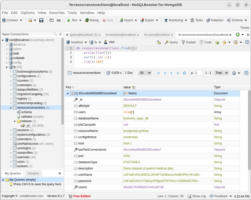 When you create a data source connection, for example, to the Synthea dataset on PostgreSQL, the details are persisted in the resourceconnections collection located in the fe database.