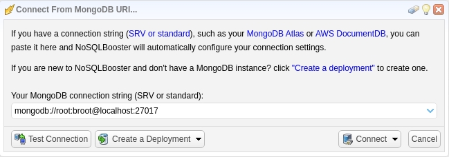 ./nosqlbooster4mongo*From the Connect option -> Connect From Connection String URI