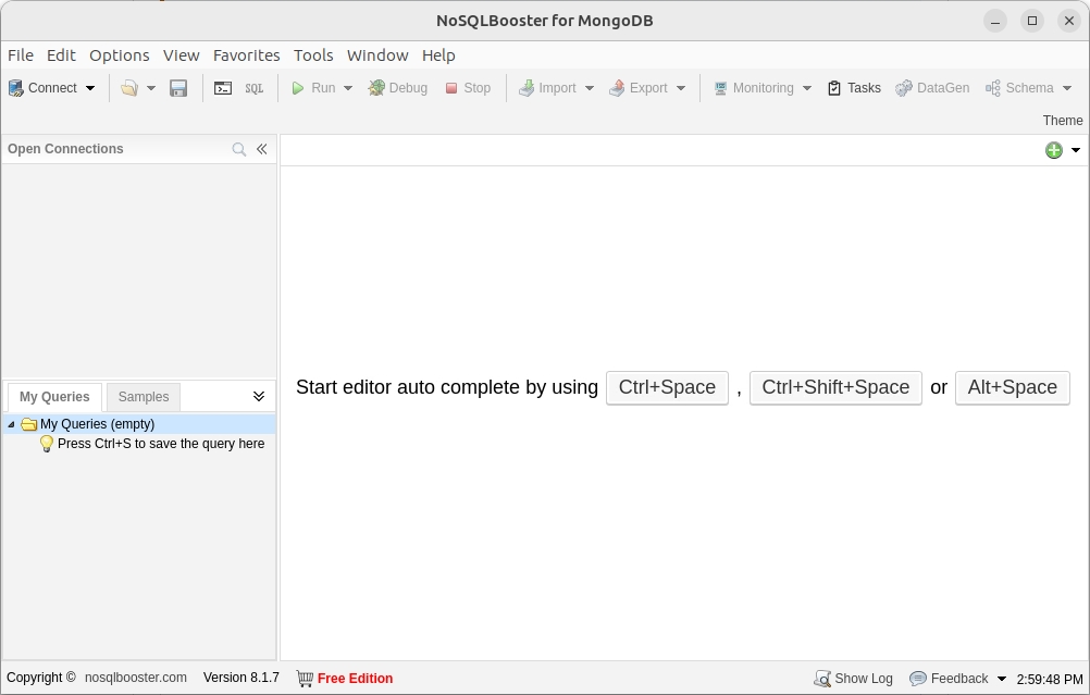 NoSQLBooster is a cross-platform GUI tool for MongoDB Server 3.6-7.0, which provides a build-in MongoDB script debugger, comprehensive server monitoring tools, chaining fluent query, SQL query, query code generator, task scheduling, ES2020 support, and advanced IntelliSense experience.
