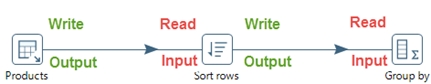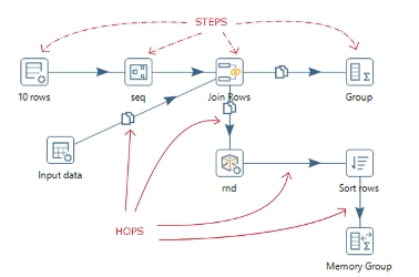 help you define the flow of the data in the stream. They represent a row buffer between the Step Output and the next Step Input, as illustrated in the below Transformation. Data flows from the Text file input step to Filter rows to Sort Rows, finally to Table output.