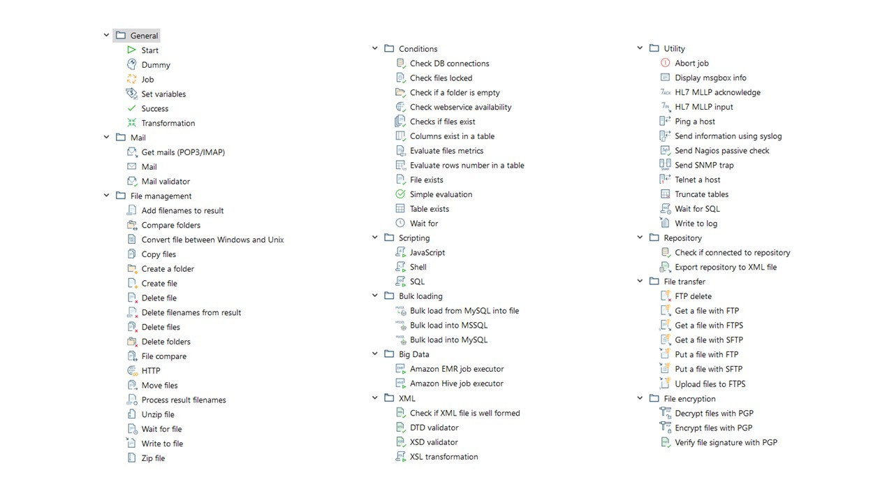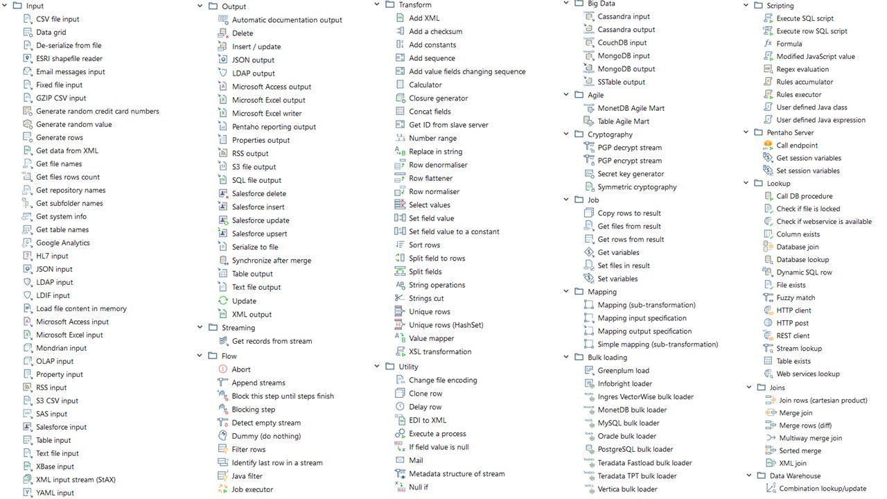 which provide you with a wide range of functionality ranging from reading text-files to implementing slowly changing dimensions.