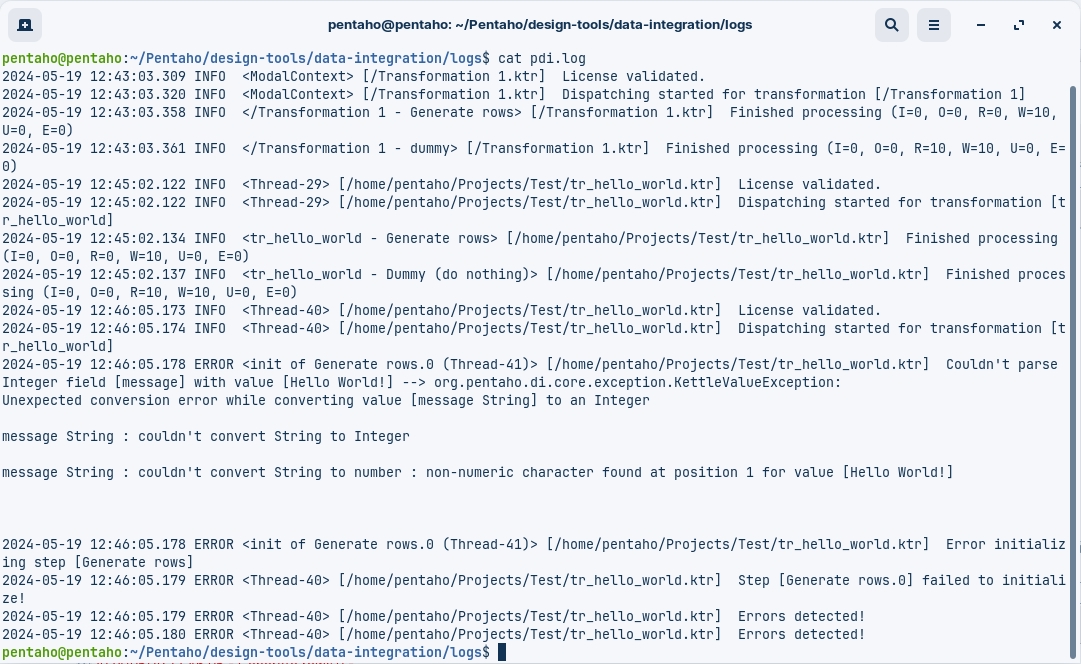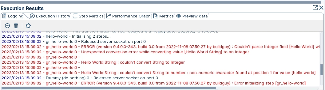 To create an error, change the Type for the field, message, from String to Integer, then view the Execution Results > Logging tab.