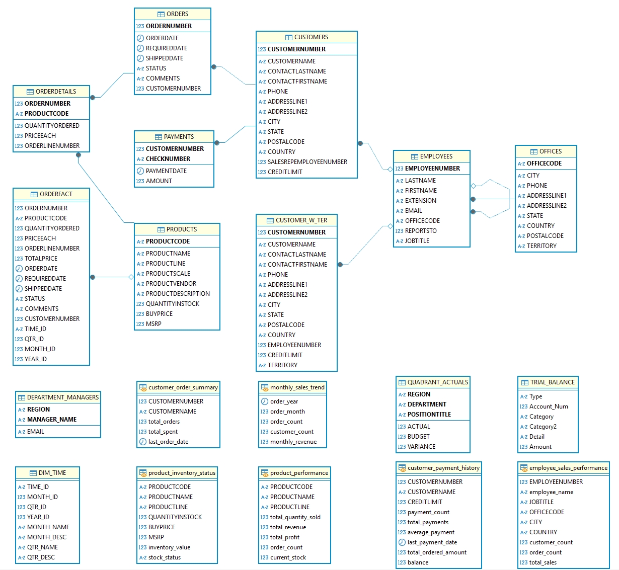 The Steel Wheels ERP database schema, is designed for a manufacturing or retail company that manages complex product sales and distribution operations. The database centers around order processing, tracking customer purchases through detailed order and order detail records, while maintaining comprehensive customer profiles including contact information, territories, and credit limits.