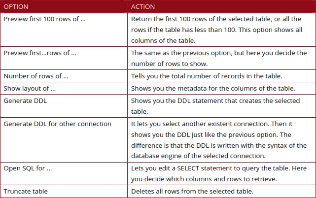 Once you have a database connection you can search for database objects in the Database Navigator, or use the search tools to find specific objects, or compare databases and their contents. You can also edit data and import and export data, and you can create reports about the database and objects in it.