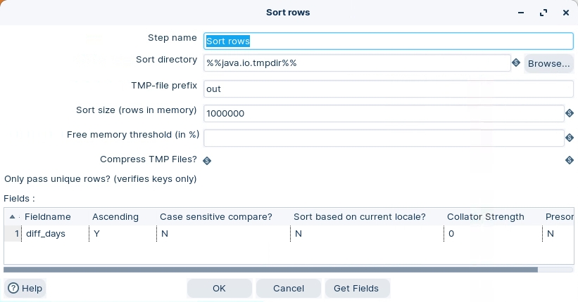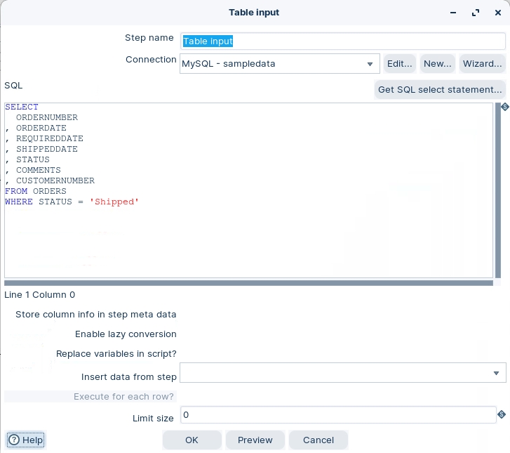 This step is used to read information from a database, using a connection and SQL. Basic SQL statements can be generated automatically by clicking Get SQL select statement.