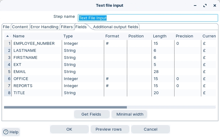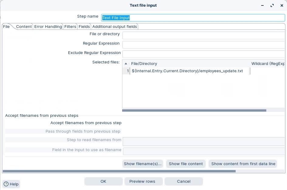 The Text File Input step is used to read data from a variety of different text-file types. The most commonly used formats include Comma Separated Values (CSV files) generated by spreadsheets and fixed width flat files.