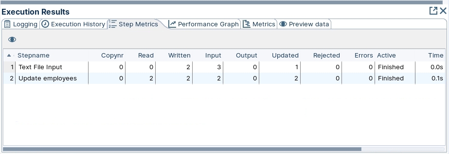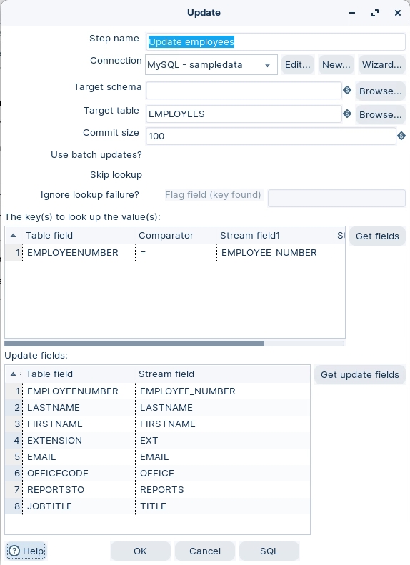 The Update step first looks up a row in a table using one or more lookup keys. If it can be found and the fields to update are all the same, no action is taken, otherwise the record is updated.