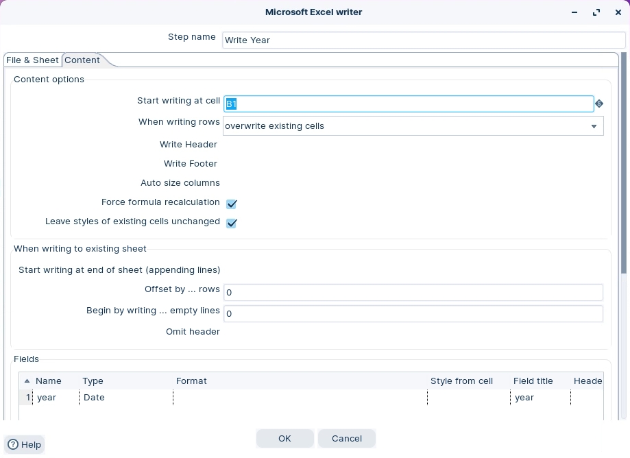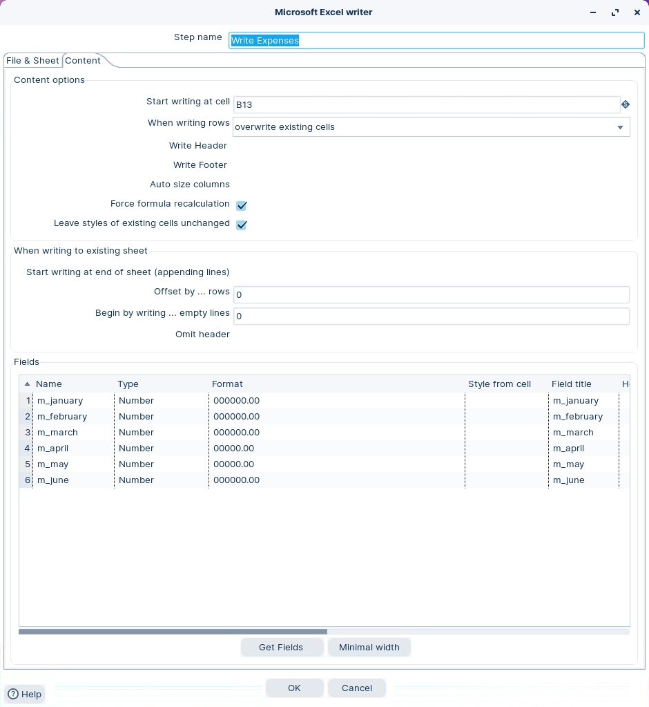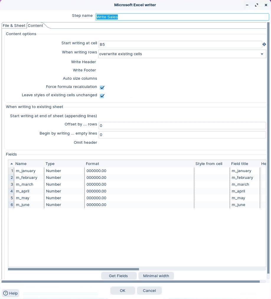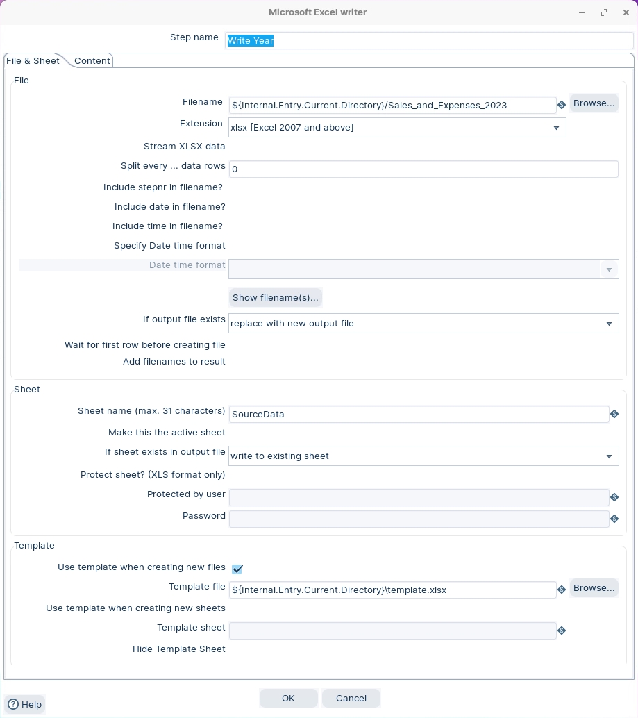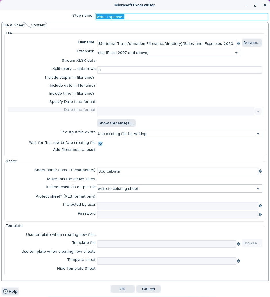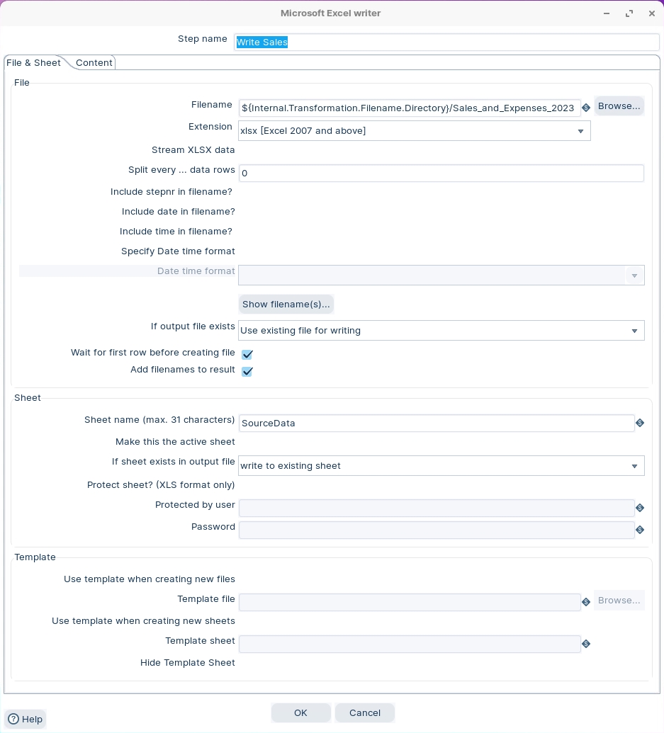 The various stages of the transformation write data to a template.xlsx. The template has 2 worksheets: