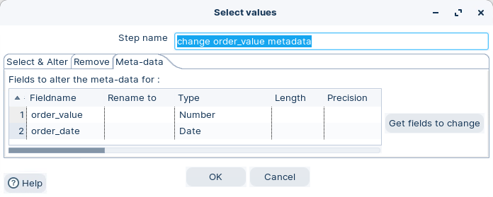 The Select Values step is useful for selecting, removing, renaming, changing data types and configuring the length and precision of the fields on the stream. These operations are organized into different categories: