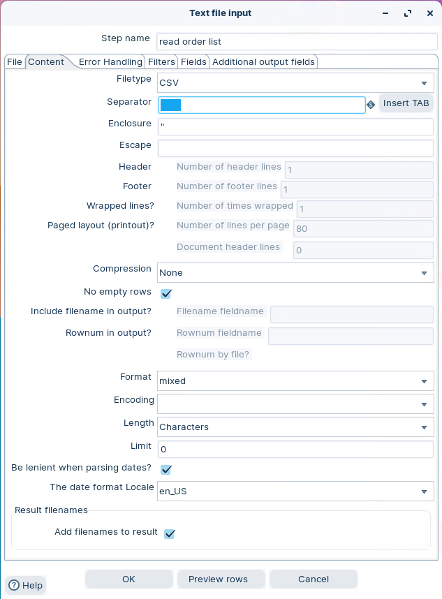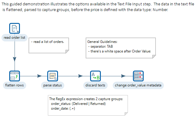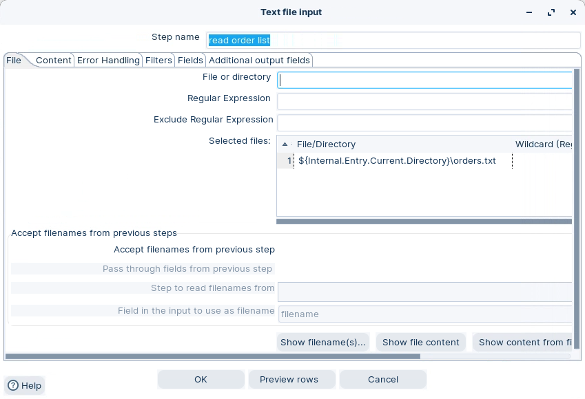 Use **Text file input** to read the raw lines from `orders.txt`. Treat each line as a single string field for now.