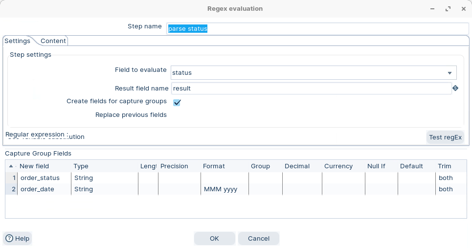 This step type allows you to match the String value of an input field against a text pattern defined by a regular expression. Optionally, you can use the regular expression step to extract substrings from the input text field matching a portion of the text pattern into new output fields. This is known as "capturing".