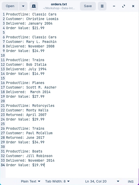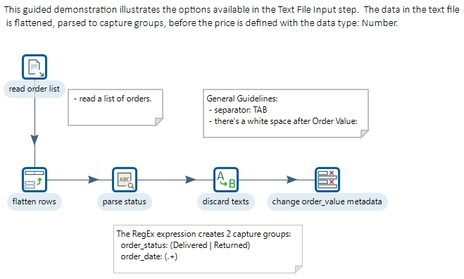 Some of the Orders data that Steel Wheels process are in a text format. In this workshop, you will flatten the list, create capture groups, replace text, and finally format the order_value.