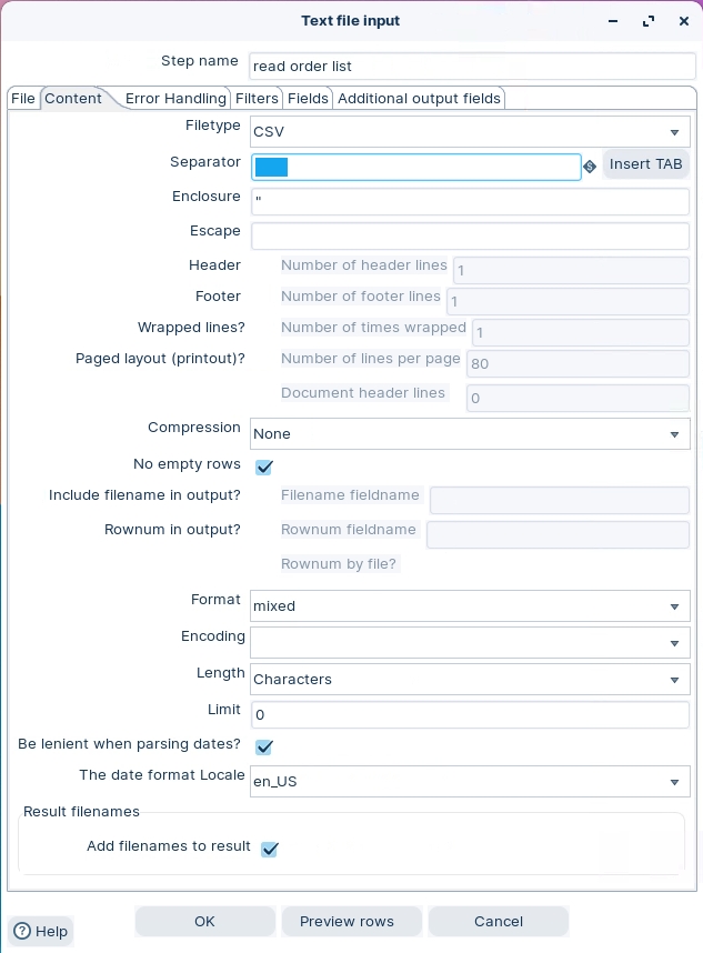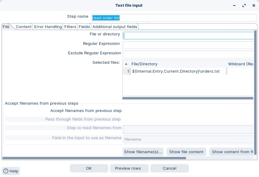 The Text File Input step is used to read data from a variety of different text-file types. The most commonly used formats include Comma Separated Values (CSV files) generated by spreadsheets and fixed width flat files.